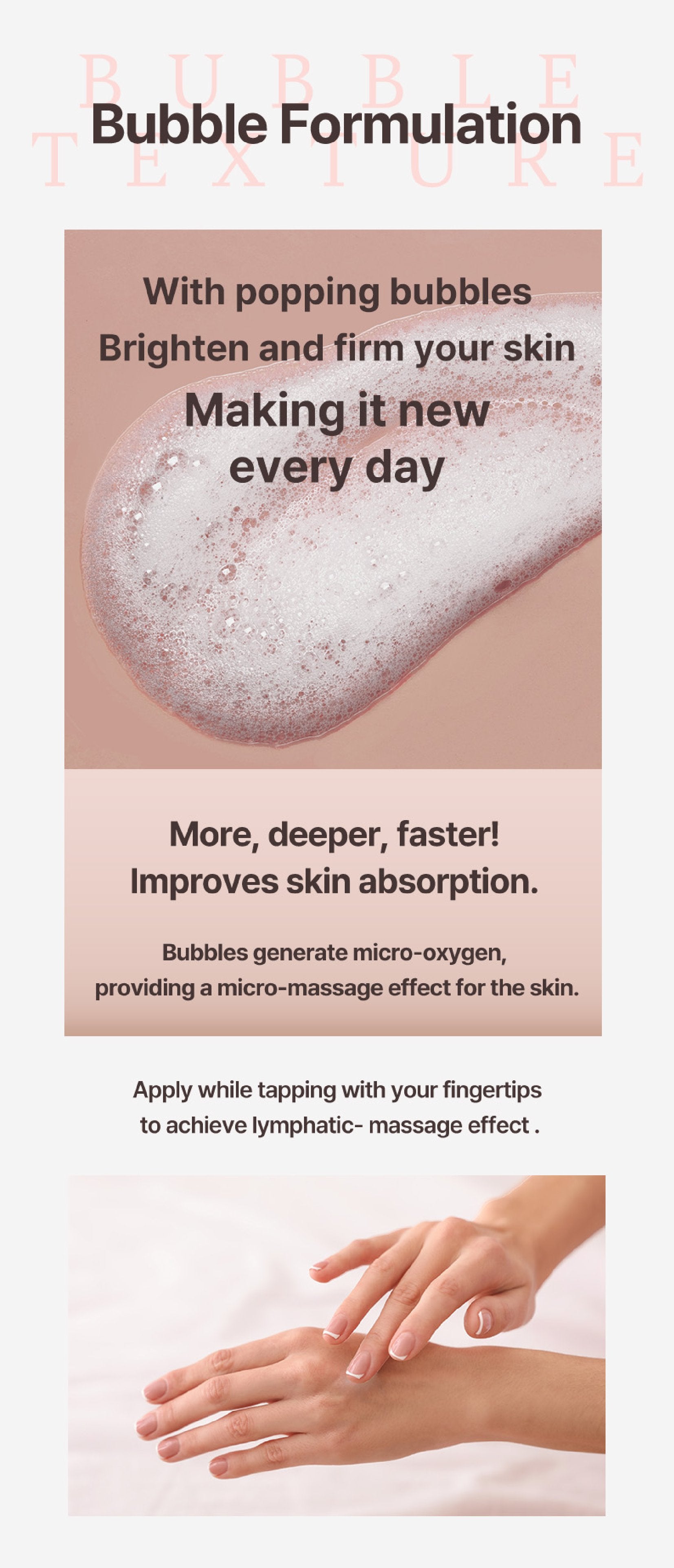 The patented bubble formulation bursts upon contact, enhancing absorption and leaving the skin smooth, supple, and glowing.
