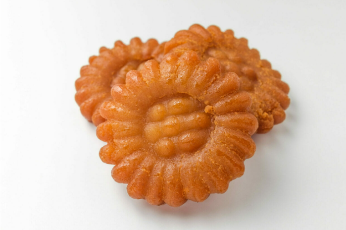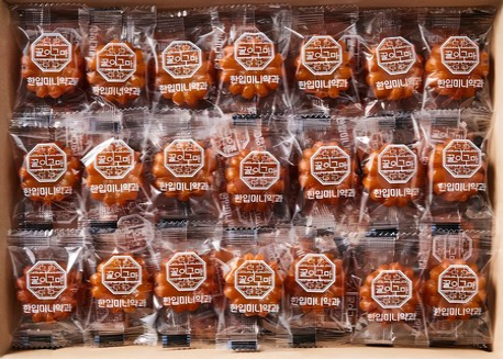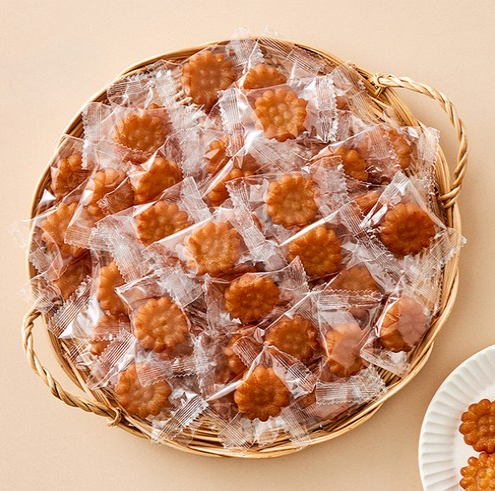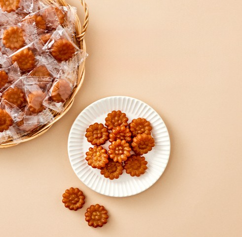 A bite-sized version of traditional Korean honey cookies. Made from wheat flour, sesame oil, and honey, these snacks are chewy, sweet, and rich in flavor.